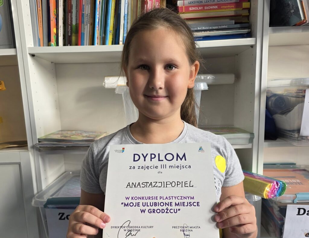 Z przyjemnością informujemy, że Anastazja Popiel, uczennica klasy IIa, zdobyła III miejsce w konkursie plastycznym „Moje ulubione miejsce w Grodźcu”. Konkurs odbył się 14 września 2025 r. podczas rodzinnego festynu